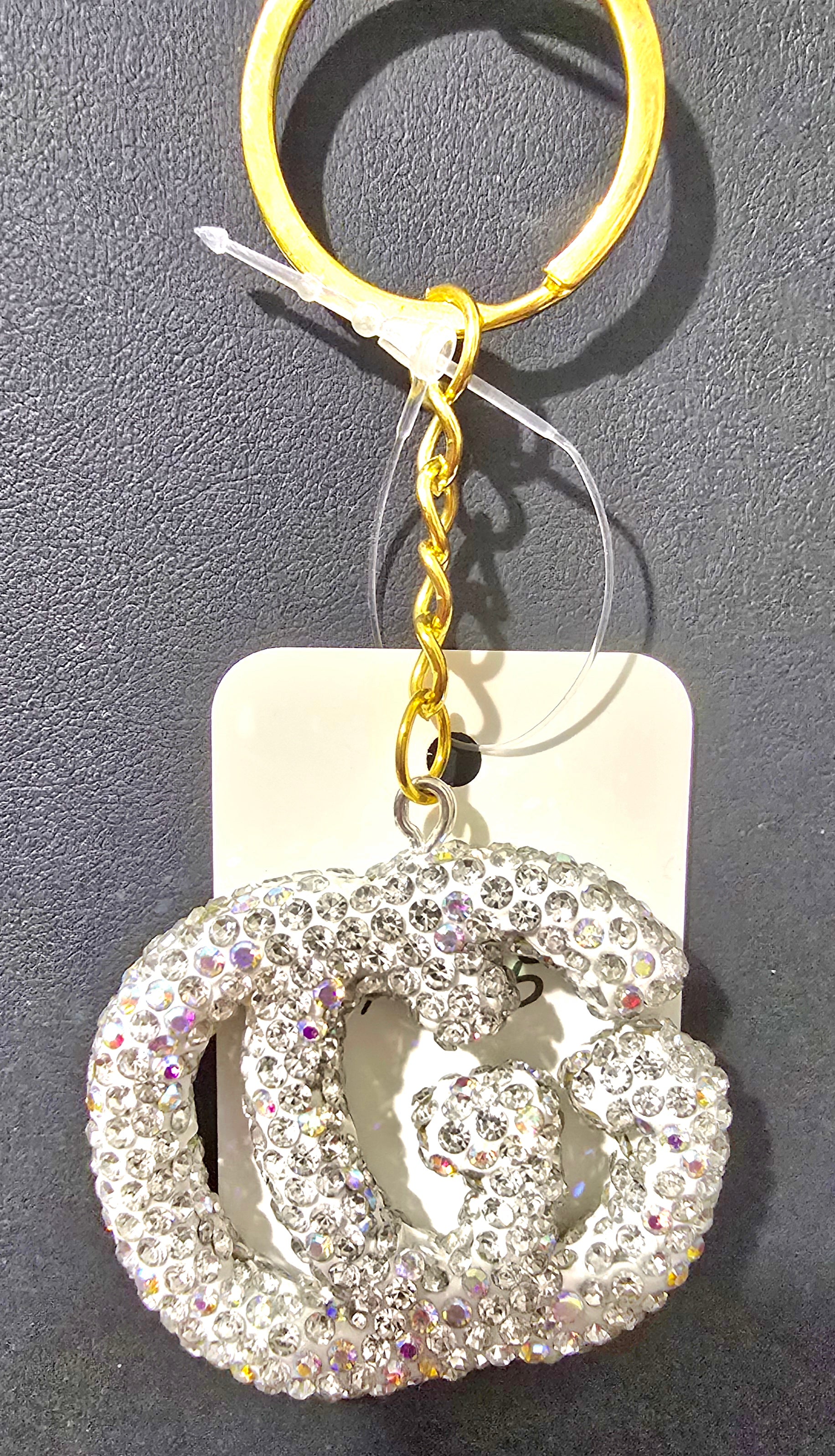 This dazzling keychain features a stylized double "G" pendant, reminiscent of the iconic designer logo, rendered in a luxe gold-tone metal and encrusted with shimmering rhinestones. The pendant hangs from a matching gold ring and chain, creating a glamorous accessory that evokes high fashion and timeless elegance. Its compact size makes it perfect for adorning handbags, keys, or even as a charm on a belt loop. The rhinestones catch the light beautifully, adding a touch of sparkle to everyday essentials.
