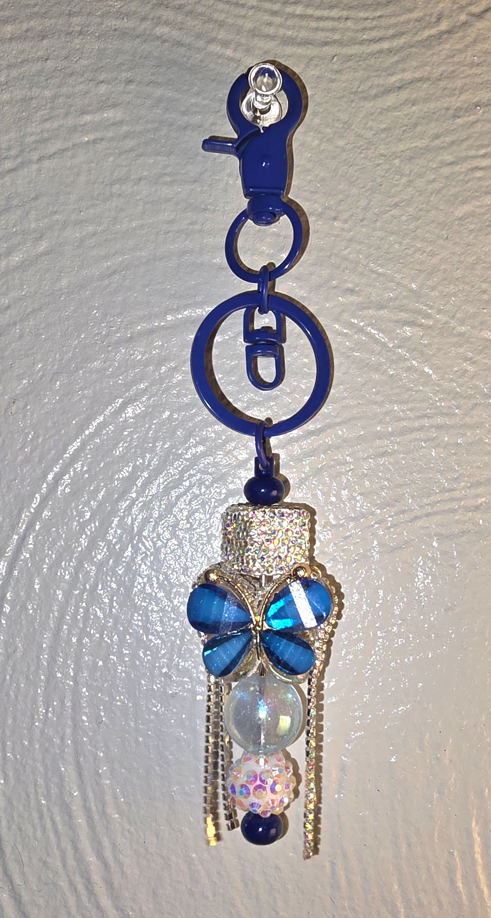 This charm is a whimsical cascade of cool-toned elegance and playful sparkle. Suspended from a translucent blue clasp, a chain of interlinked rings leads the eye downward to a dazzling centerpiece. At the top, a silver glitter cylinder anchors the design, followed by a butterfly-like burst of faceted blue beads—evoking fluttering wings mid-flight. Beneath it, two spherical beads shimmer with contrast: one a pearlescent white, the other a holographic orb that catches light like a prism. Tiny navy beads and delicate silver chains dangle below, adding movement and a touch of mystery. It’s a piece that feels like a frozen moment from a dream—icy, magical, and full of charm.