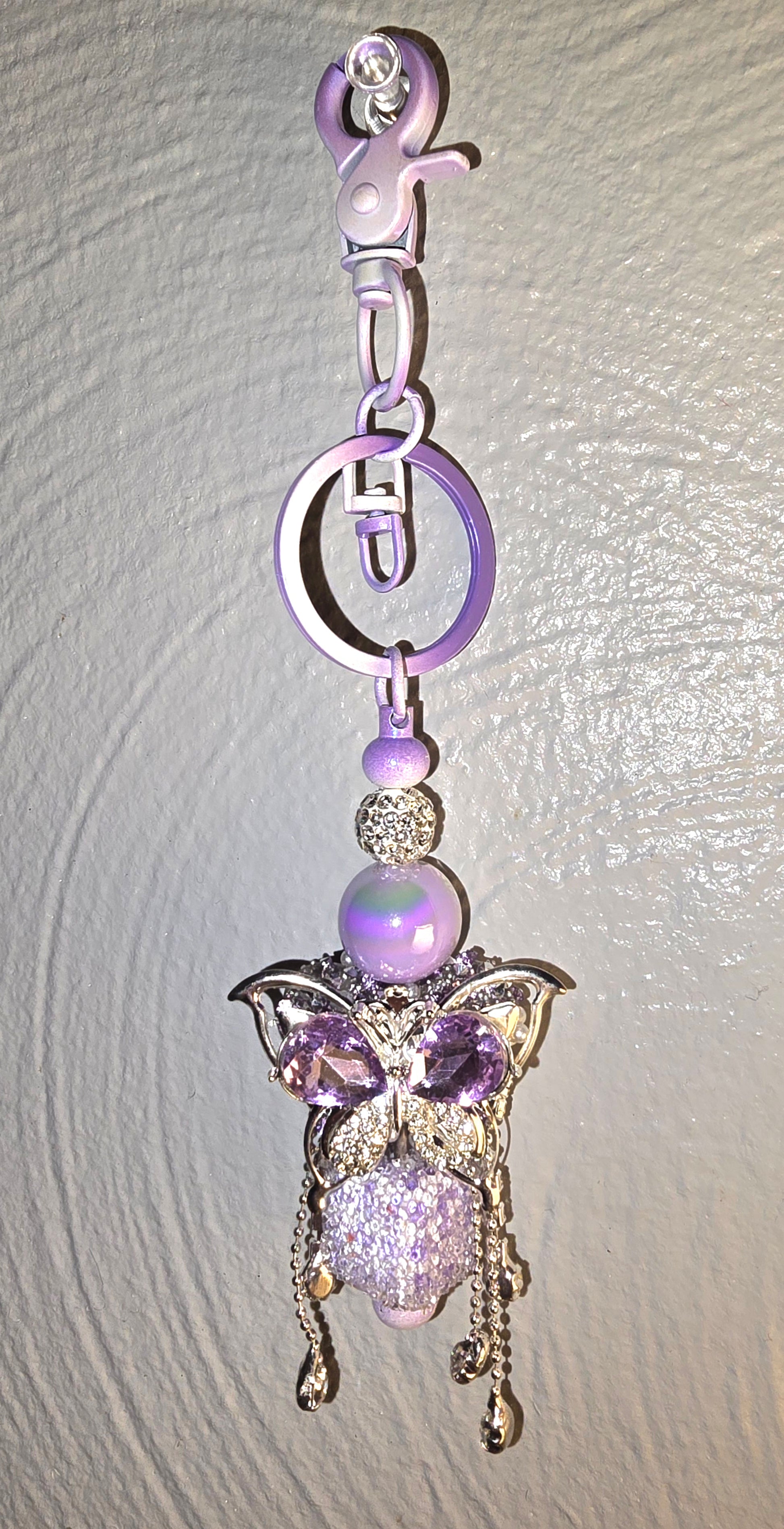 This piece is pure enchantment—a whimsical cascade of violet and silver that feels like it fluttered out of a fairytale. At the top, a translucent purple clasp and ring set the tone: playful yet polished. A series of beads leads the eye to the centerpiece—a butterfly with shimmering silver wings, dusted in glitter and studded with violet gemstones. It’s regal, like something a forest queen might wear. Beneath it, a glittery orb dangles like a magical charm, trailing delicate chains and beads that sway with movement. The entire composition evokes flight, fantasy, and a touch of glam.