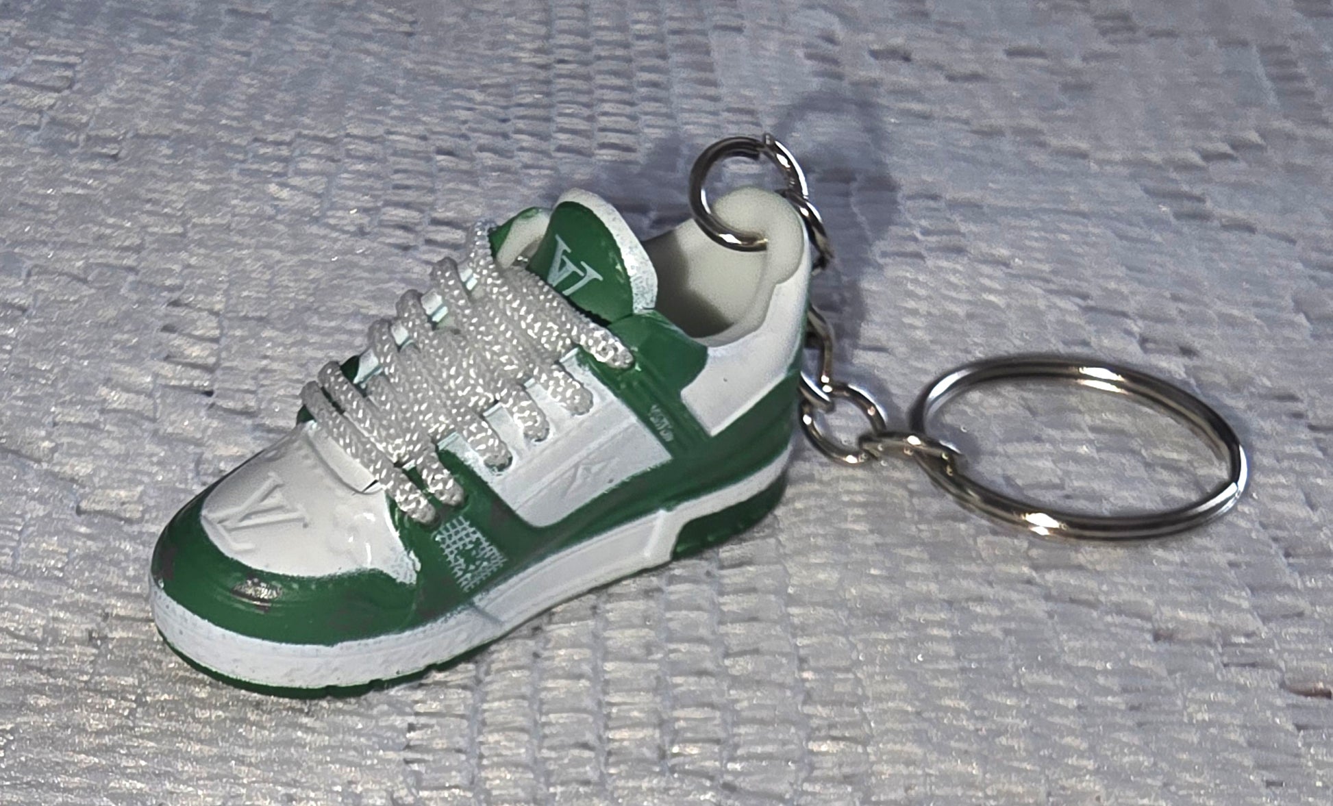 A tiny sneaker with major style cred. This LV-inspired keychain reimagines streetwear chic in miniature form, featuring a crisp white upper accented with rich green detailing and glitter-laced shoelaces for a touch of sparkle. The iconic LV logo adds a luxe stamp to the sporty silhouette, while the realistic sole and stitching elevate it from novelty to collectible. Finished with a sleek metal keyring, it’s the perfect charm for bags, keys, or curated accessory chains.