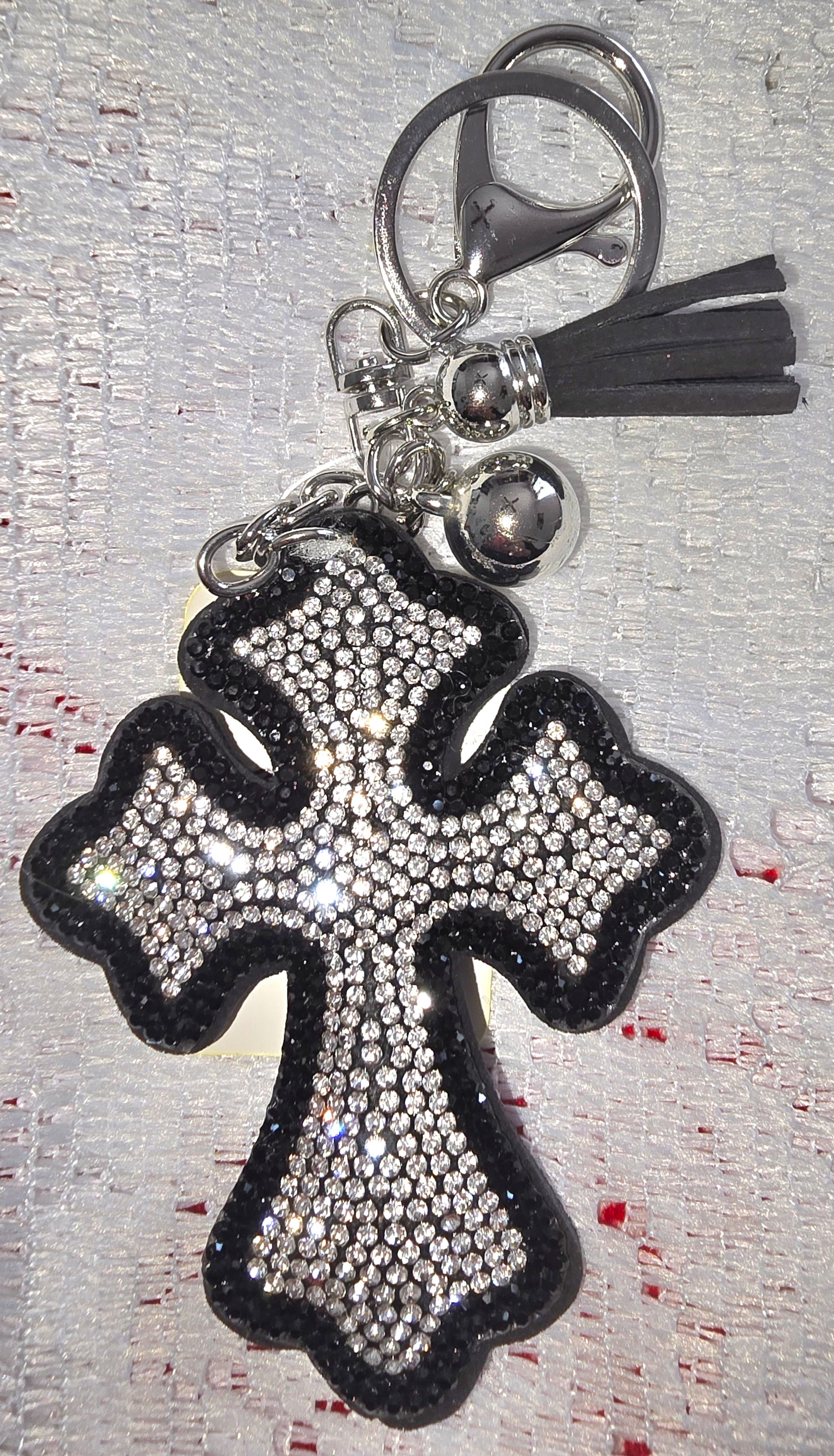 This dazzling keychain is a bold fusion of gothic elegance and luxe sparkle. At its heart is a cross-shaped pendant, outlined in sleek black and encrusted with a constellation of rhinestones that catch the light with every movement. The contrast between the dark border and the shimmering stones creates a dramatic, high-impact look. Complementing the pendant are a silky black tassel and a polished metallic orb, adding texture and dimension. The clasp is sturdy and stylish, perfect for attaching to a designer bag or set of keys. Altogether, it evokes a sense of edgy glamour—like a relic from a rockstar’s treasure chest or a cathedral reimagined in rhinestones.
