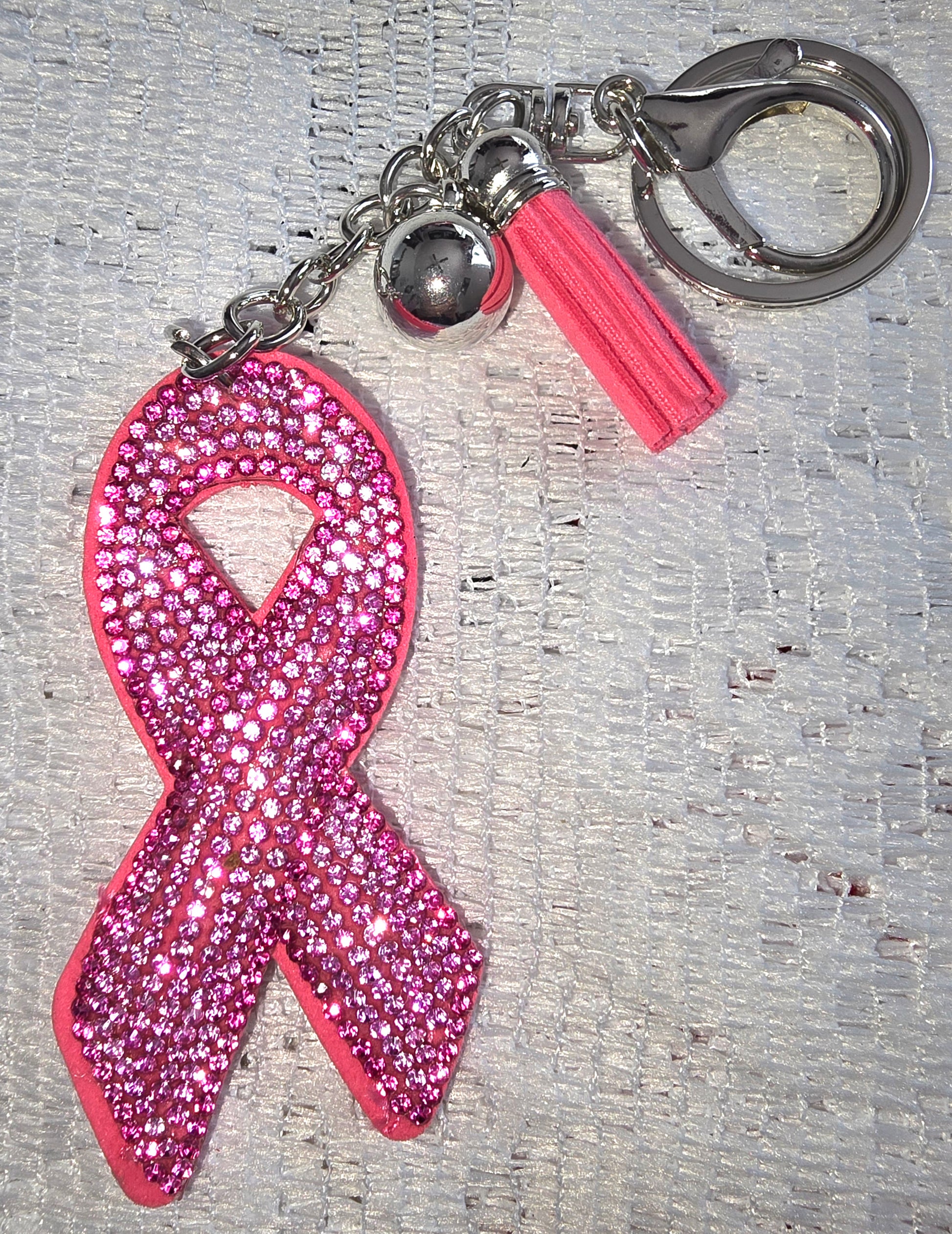 A radiant emblem of hope and solidarity, this keychain features a shimmering pink ribbon encrusted with delicate rhinestones—an unmistakable symbol of breast cancer awareness. The charm is paired with a soft pink tassel and a polished metallic bead, adding texture and movement to the piece. Finished with a sleek keyring clasp, it’s both a meaningful token and a stylish accessory. Whether clipped to a bag or keys, it carries a message of strength, support, and compassion.