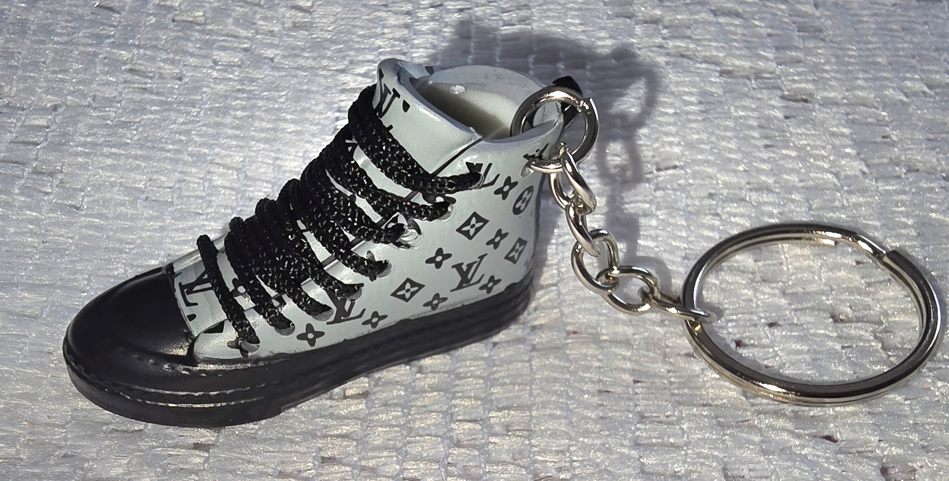 This miniature sneaker keychain is a streetwear-meets-luxury statement piece. Styled like a high-top trainer, it features a sleek black sole and matching laces, contrasted by a soft gray upper adorned with black monogram-inspired symbols reminiscent of LV’s iconic pattern. The texture and detailing evoke the feel of premium canvas, while the compact silhouette makes it a playful yet elevated accessory. Suspended from a silver-tone chain and keyring, it’s perfect for adding a touch of designer flair to your bag, belt loop, or key set.