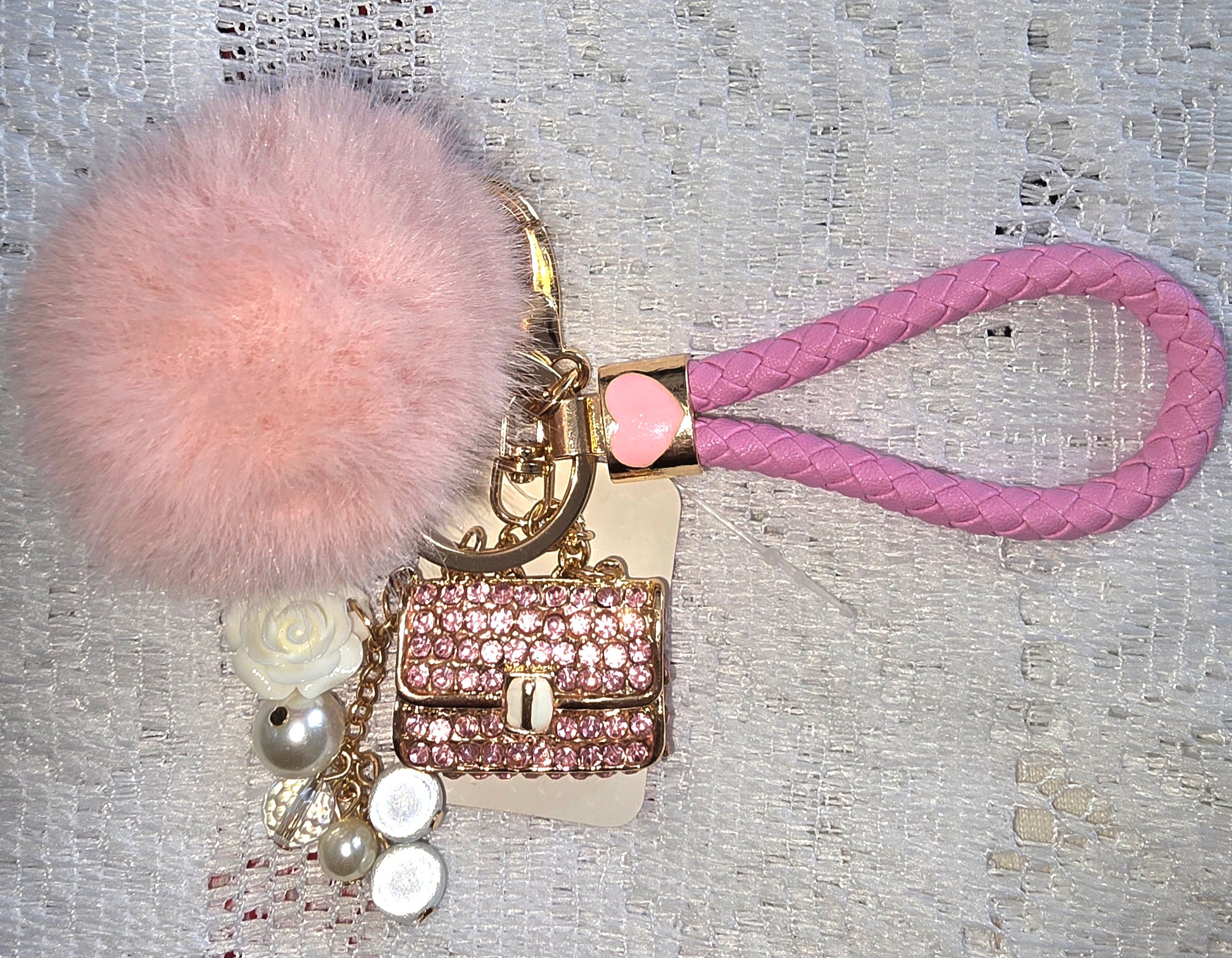 This keychain is a whimsical celebration of feminine luxury, blending soft textures with sparkling charm. At its heart is a plush pink pom-pom, radiating playful elegance. A braided wrist strap in matching blush tones adds practicality with flair, anchored by a gold connector adorned with a tiny pink heart. The standout feature—a miniature CC handbag charm—is drenched in pink rhinestones and trimmed with gold, evoking the glamour of a designer clutch. Surrounding it is a curated cluster of romantic accents: a delicate white rose, creamy faux pearls, and glittering rhinestone discs that catch the light like tiny stars.