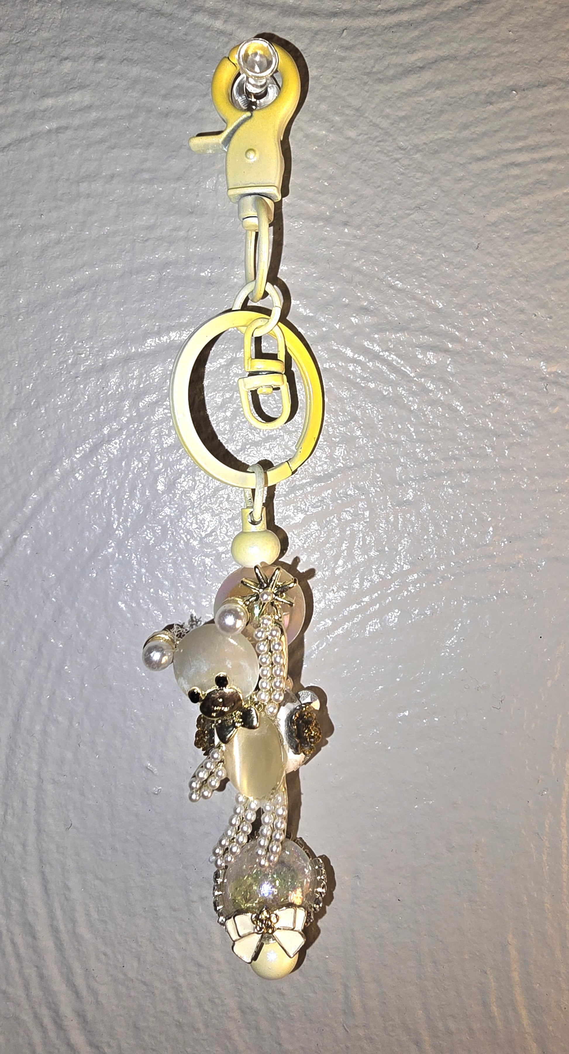 This dazzling accessory is a miniature marvel of luxury and whimsy. Suspended from a polished clasp, the keychain begins with a sleek circular ring. Below it hangs the true showstopper: a beaded bear figure crafted from lustrous pearls, shimmering rhinestones, and gleaming metallic beads. Its limbs and head sparkle with intricate embellishments, giving it a couture-like finish. The bear’s expression is sweet yet regal, like a tiny guardian of glamour. It’s the kind of piece that turns a handbag into a conversation starter.