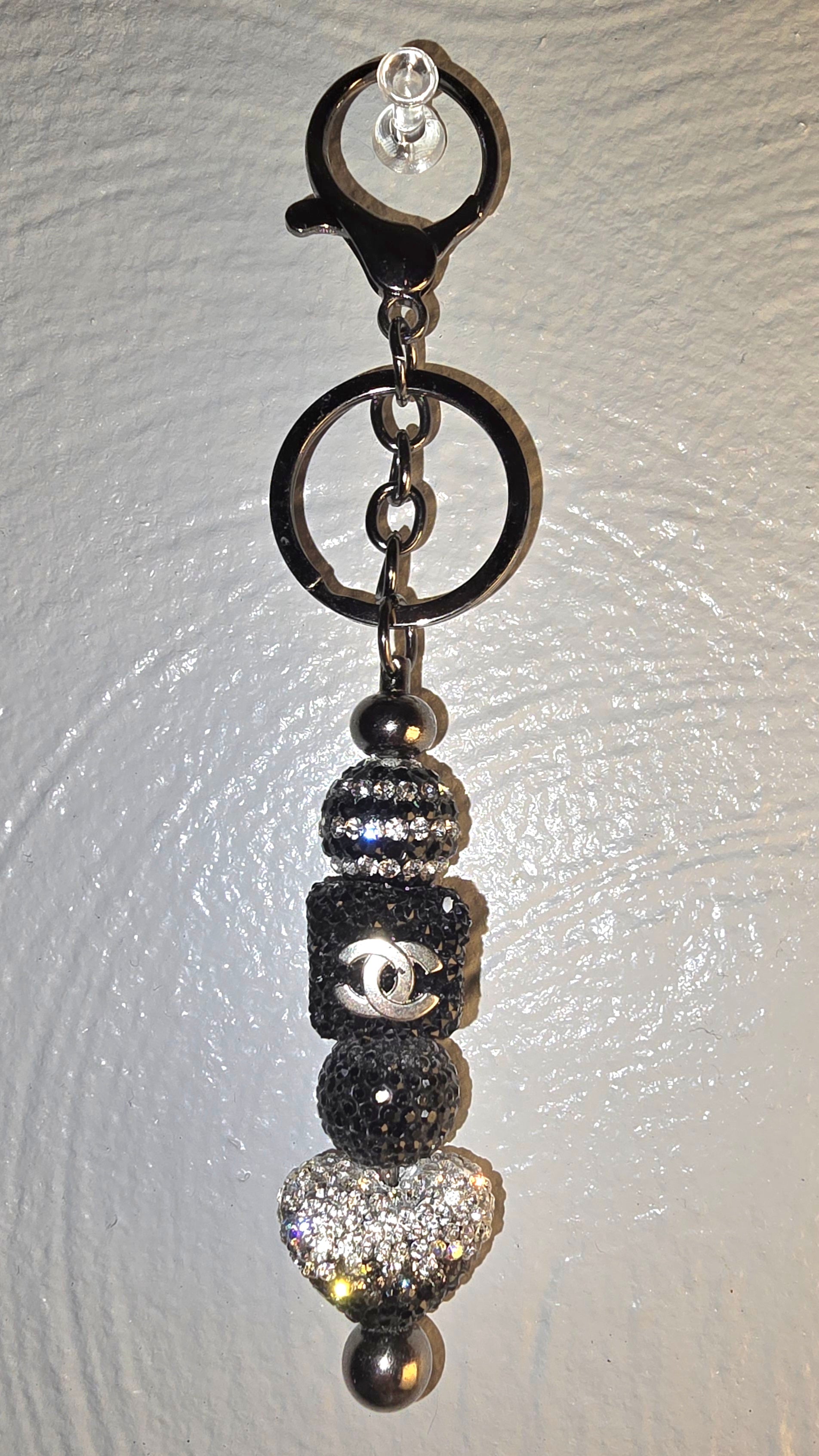 This elegant keychain is a monochrome symphony of texture and sparkle. Suspended from a sleek black clasp, the charm cascades into a vertical arrangement of beads that balance luxury with edge. At its heart is a glossy black bead emblazoned with the iconic CC logo in silver—an unmistakable nod to haute couture. Above and below, glittering silver beads catch the light like stardust, while a textured matte black bead adds depth and contrast. The overall silhouette is refined yet bold, perfect for elevating a handbag, backpack, or even a belt loop with a whisper of Parisian glamour.