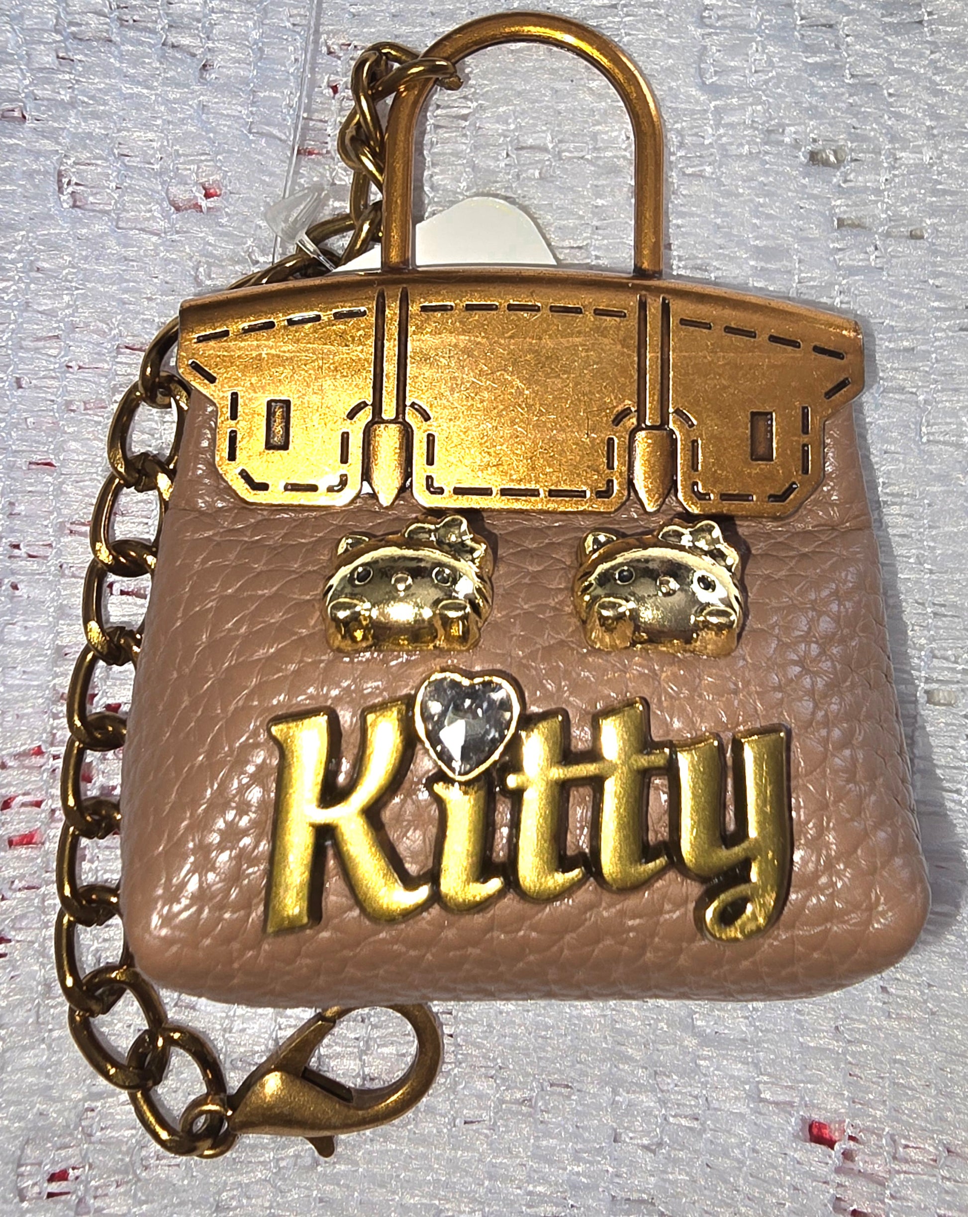 This charming accessory is a miniature HK handbag keychain that blends playful elegance with luxe detailing. Crafted from textured light brown material, it features a metallic gold flap adorned with stitched accents and two tiny gold embellishments resembling whimsical animal faces—perhaps kittens or bears. The word “Kitty” gleams in gold lettering across the front, with a heart-shaped gem dotting the “i” for a sweet, sparkling touch. A gold chain and clasp complete the piece, making it perfect for attaching to bags, keys, or charm bracelets. It’s a delightful fusion of fashion and fantasy, ideal for lovers of cute motifs and designer-inspired flair.