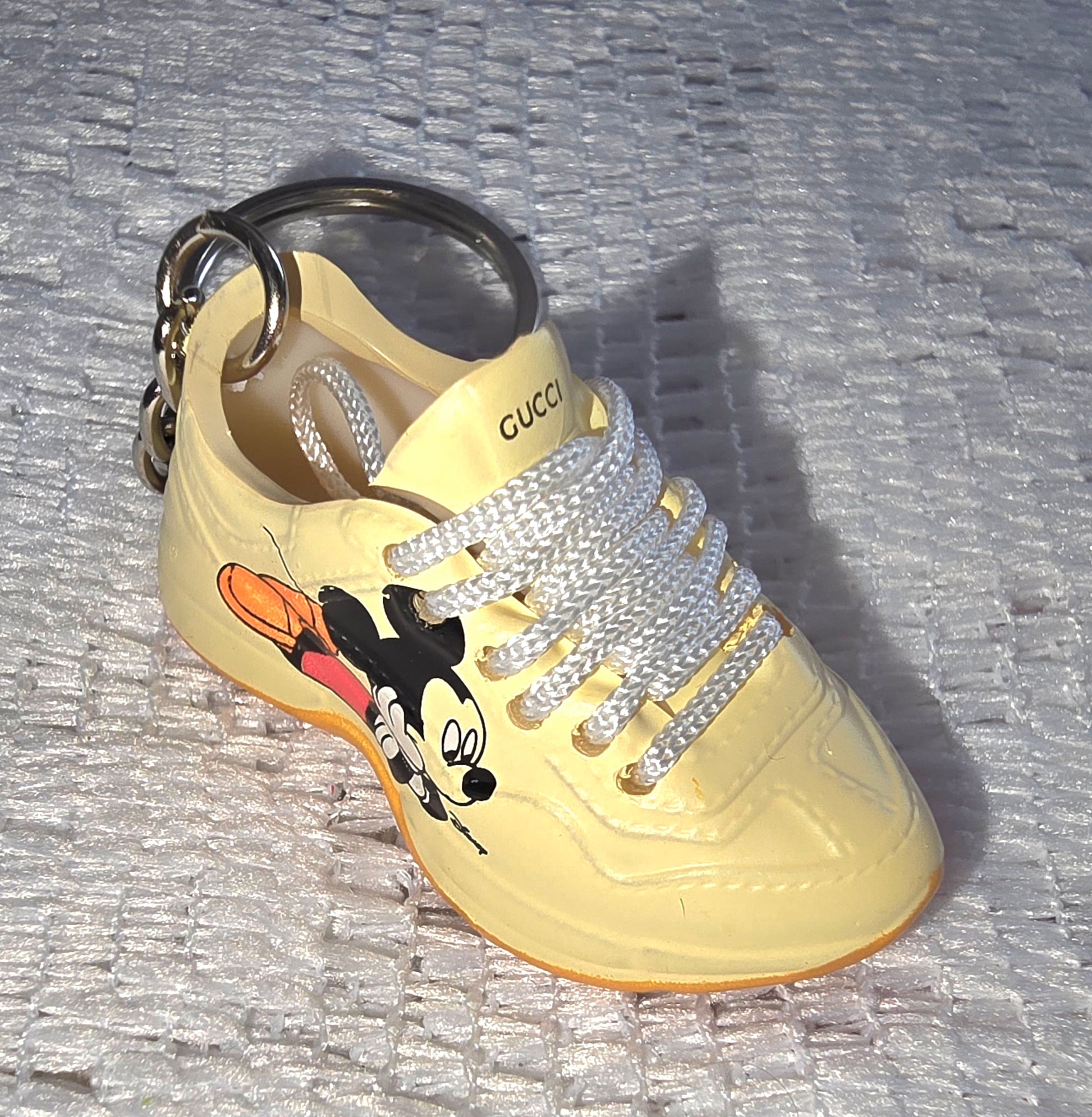 A light yellow mini sneaker keychain styled after GG’s luxury streetwear aesthetic. It features crisp white laces, a bold “GG” logo on the tongue, and a cheerful Mickey Mouse graphic printed on the outer side—bringing Disney charm to designer flair. The sneaker’s heel is fitted with a sleek metal ring, making it a collectible accessory that doubles as a conversation starter. The textured white backdrop enhances its luxe-meets-playful vibe, perfect for fans of iconic mashups.