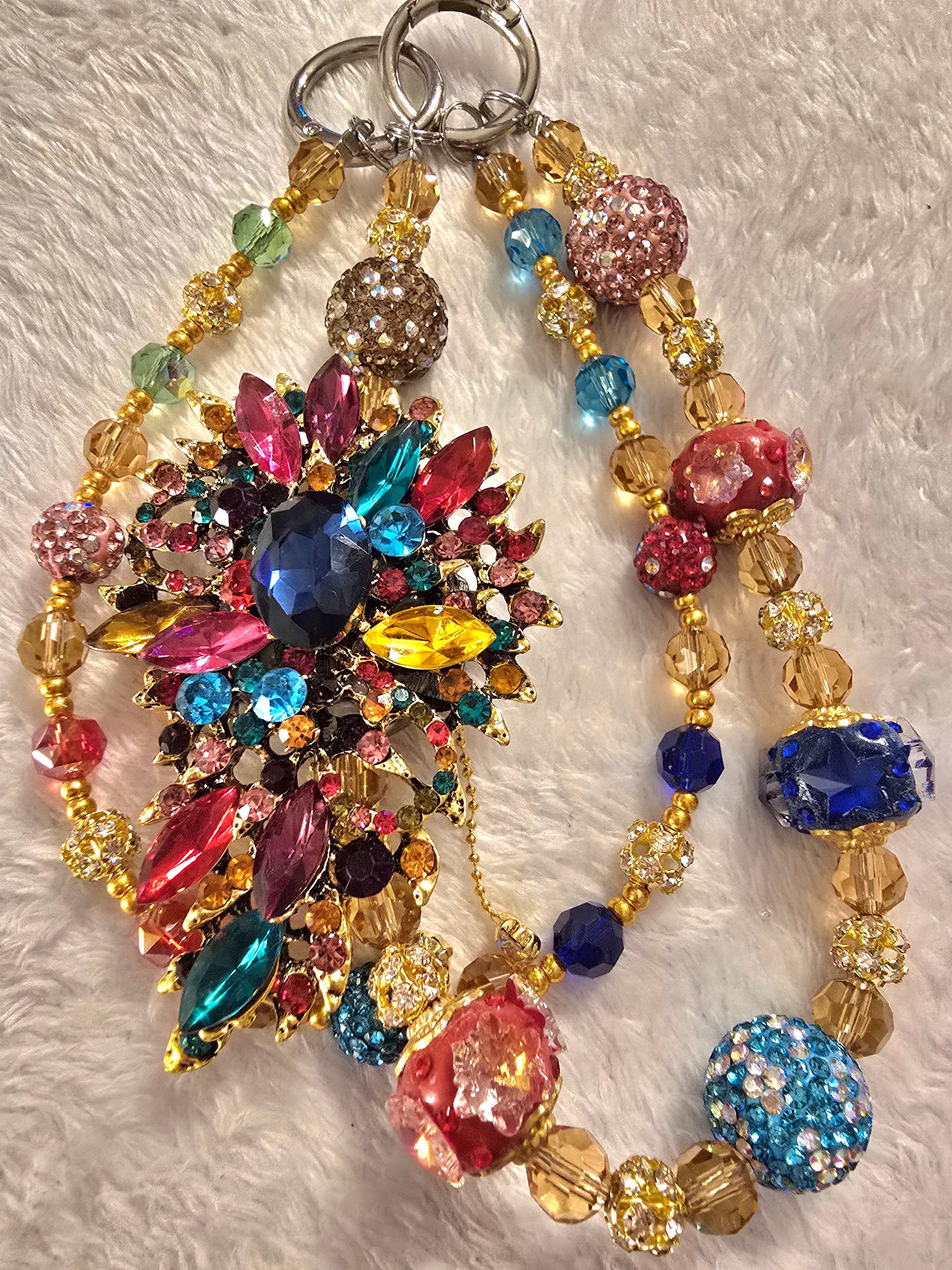 A radiant burst of color and charm, this chain is a celebration of joyful opulence. Faceted rhinestones in candy-bright hues—fuchsia, lemon, aqua, and lilac—cluster like petals in a fantastical garden, each one catching the light with dazzling brilliance. The central gem anchors the piece with a bold sparkle, while surrounding stones shimmer like dew drops on a spring morning. Set in a polished gold-tone frame, the brooch evokes vintage glamour with a modern, playful twist.