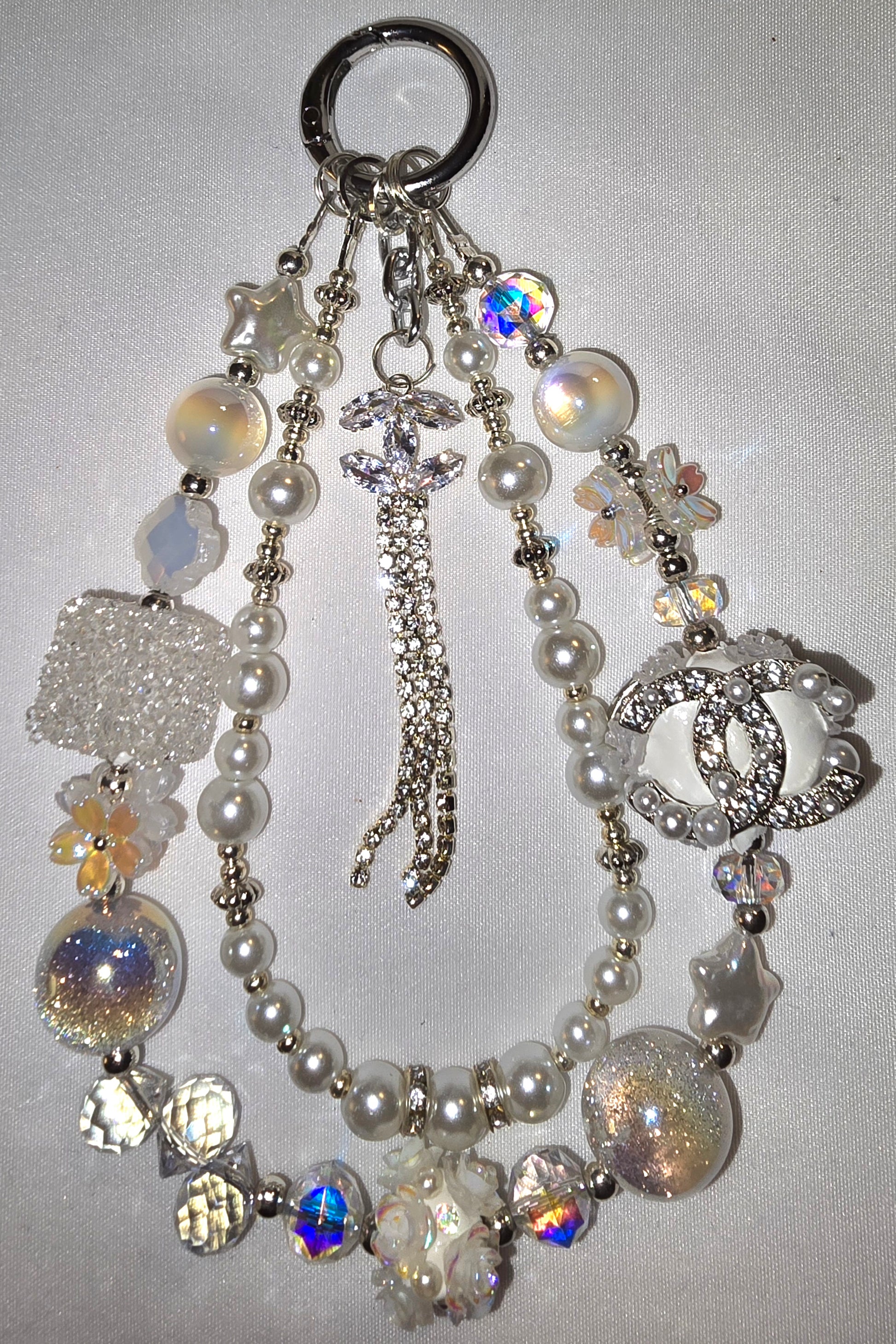This accessory is a dazzling celebration of opulence and whimsy. Suspended from a central ring, two elegant strands cascade with faux pearls, iridescent beads, and metallic spacers, evoking the shimmer of moonlight on water. A rhinestone-studded tassel adds movement and drama, while the pièce de résistance—a rhinestone-encrusted double "C" logo—anchors the piece in unmistakable luxury. Scattered throughout are star-shaped and flower-shaped beads, glitter-filled spheres, and a cube of crystalline brilliance, each element contributing to a celestial, dreamlike aesthetic. It’s a miniature galaxy of glamour, perfect for adorning a handbag, keyring, or charm bracelet.