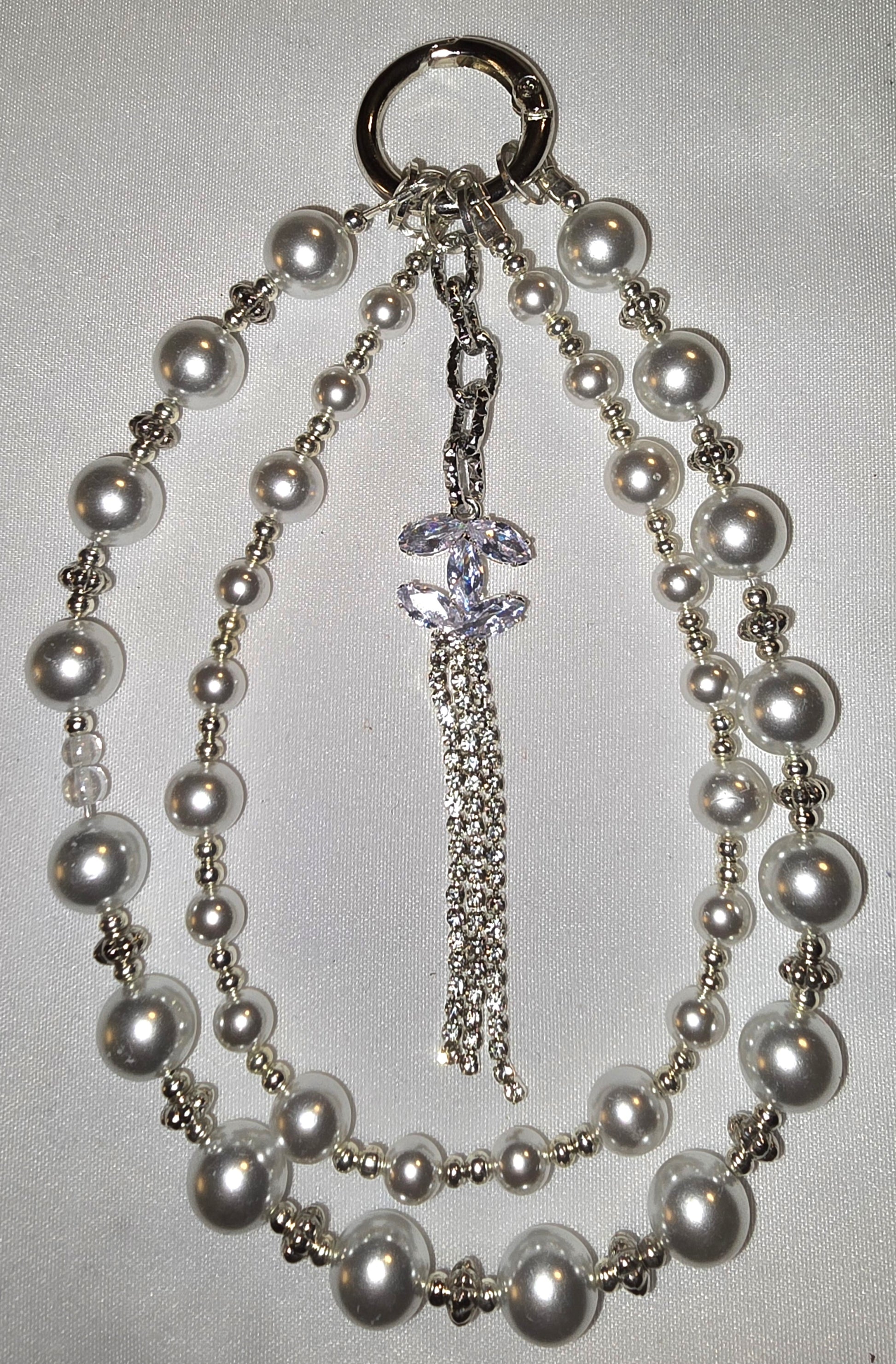 This accessory is a dazzling fusion of elegance and playful luxury. Twin strands of faux pearls and metallic beads form a graceful loop, anchored by a central silver-toned ring. From this ring cascades a rhinestone-encrusted CC logo, flanked by delicate chain tassels that shimmer with movement. The contrast between the soft luster of pearls and the sparkle of rhinestones evokes a sense of vintage glamour with a modern twist—perfect for adorning handbags, belt loops, or even as a statement keychain.