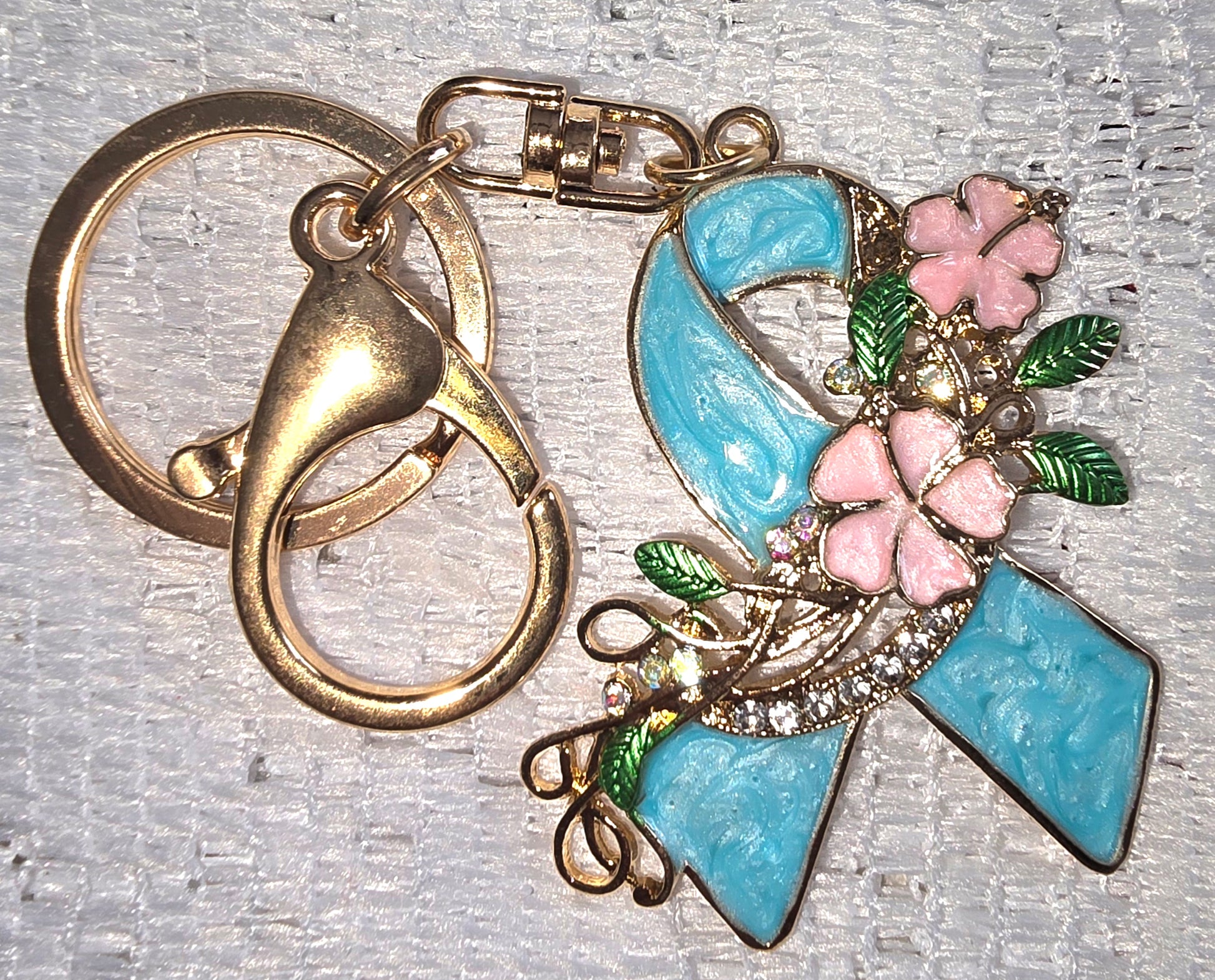 A graceful ribbon-shaped keychain rendered in soft marbled blue enamel, accented with blush-pink blossoms and verdant green leaves. Tiny clear rhinestones are nestled among the petals, catching the light like morning dew. The gold-toned hardware adds a touch of luxe, while the floral motif evokes springtime serenity and gentle elegance. The ribbon silhouette suggests awareness and care, making this charm both beautiful and meaningful.
