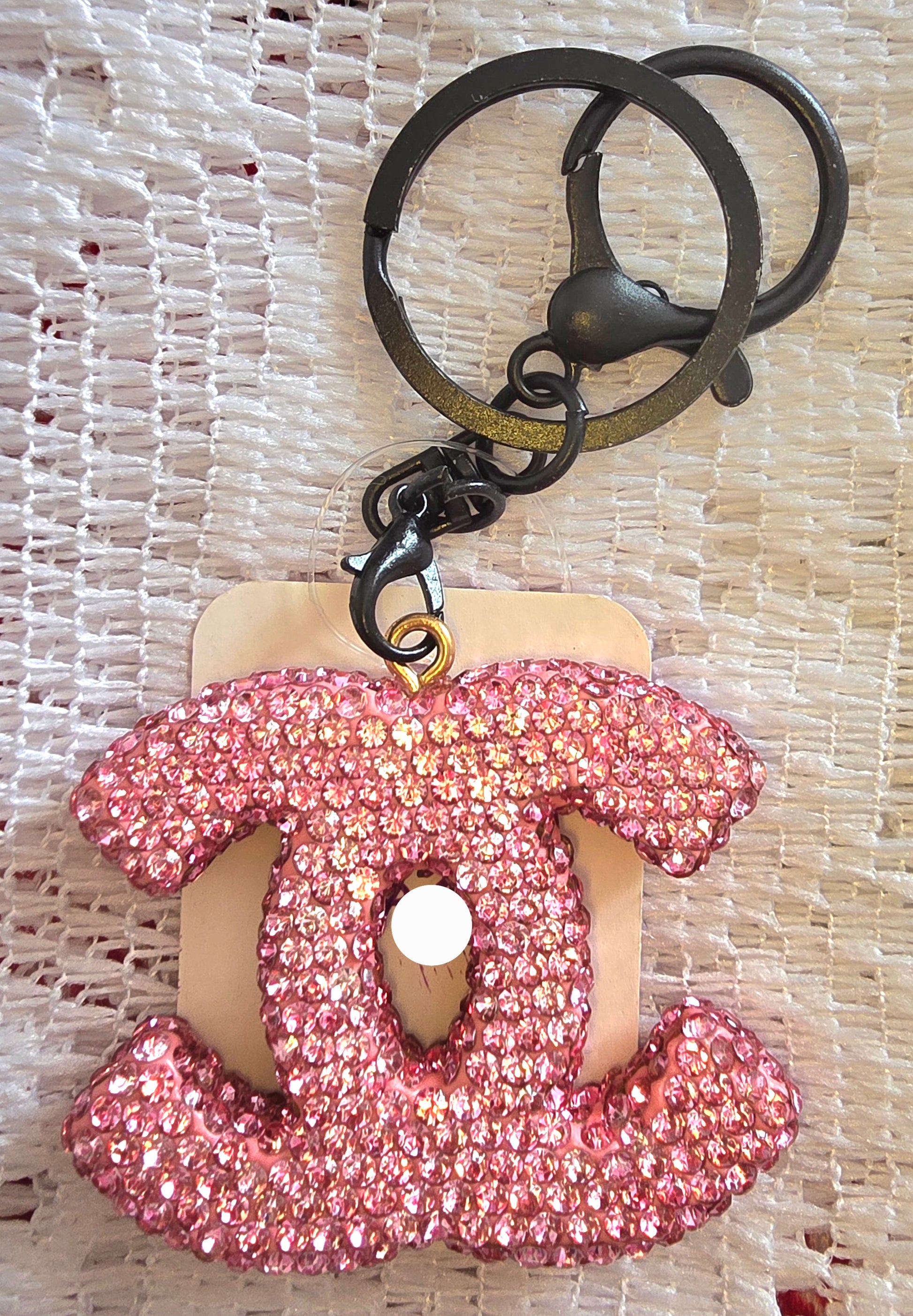 This dazzling keychain is a bold tribute to iconic luxury. At its heart is a radiant pink charm shaped like the classic interlocking "C"s, completely encrusted in rhinestones that catch the light with every movement. The charm hangs from a sleek black metal keyring and clasp, adding a modern edge to the otherwise ultra-feminine design. Set against a lace-like white fabric, the piece evokes a blend of Parisian elegance and playful glamour—perfect for those who love their accessories with a wink of opulence.