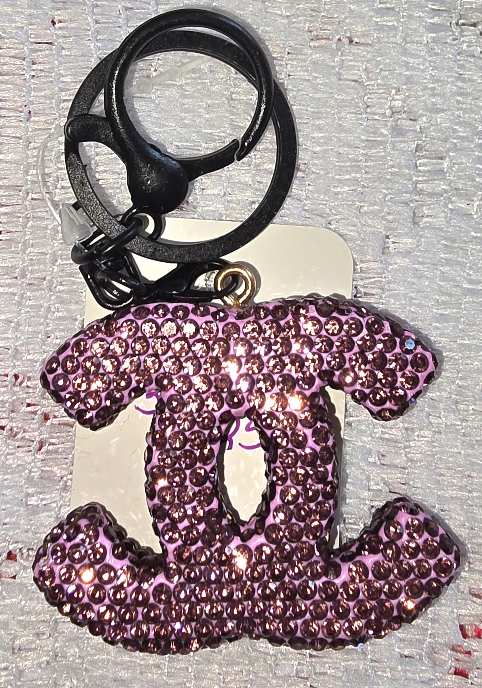 This dazzling keychain is a miniature celebration of luxury and playful glamour. At its heart is the iconic designer logo—two interlocking C’s—rendered in a radiant purple rhinestone finish that catches the light with every movement. The rhinestones are tightly set for a high-impact sparkle, giving the piece a jewel-like quality. The pendant hangs from a sleek black plastic ring and clasp, offering a bold contrast that enhances the brilliance of the pink. It’s a chic accessory for fashion lovers who adore statement pieces with a touch of whimsy.