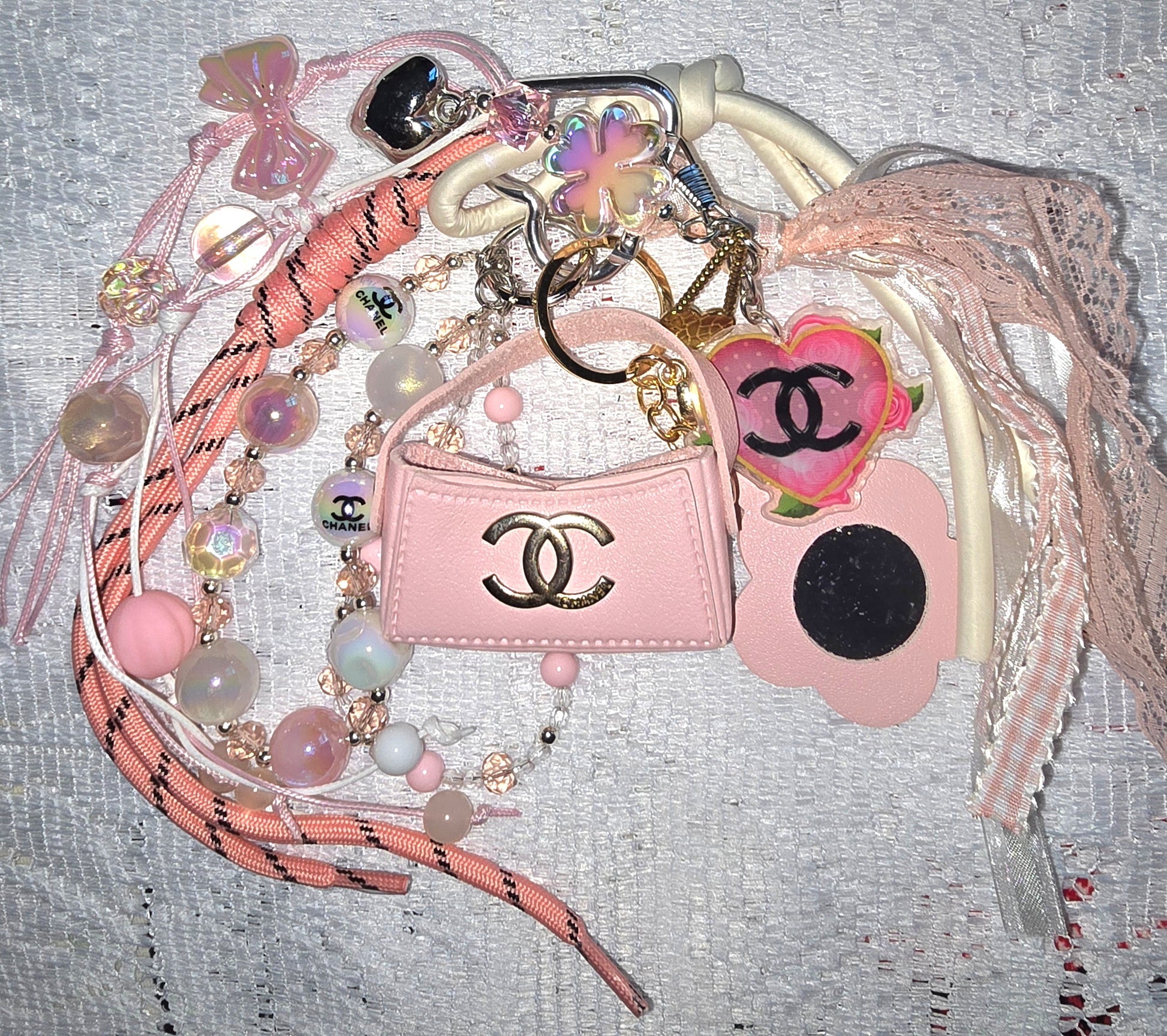 This bag chain accessory ensemble is a dreamy confection of pinks, pearls, and playful luxury. At its heart is a miniature handbag (functional) emblazoned with the iconic CC logo in gleaming gold—like a couture talisman. Surrounding it, a symphony of whimsical details unfolds: a pink bow, a heart-shaped logo charm, braided cords, and iridescent beads that shimmer like candy drops. The pink flower with a mirror center adds a touch of drama, while the lace tassel softens the scene with vintage romance. Altogether, it evokes a Parisian fantasy—where elegance meets enchantment on a bed of lace.