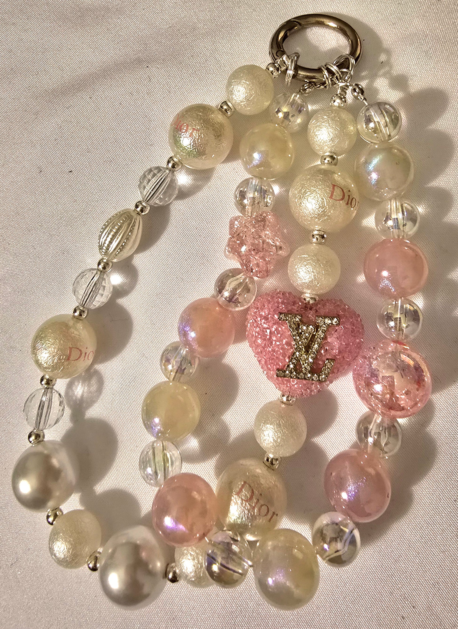 This accessory is a dazzling fusion of playful charm and high-fashion fantasy. It features a double-strand design of mixed beads—pearlescent whites, translucent pinks, and ridged clears—each adding texture and light-catching brilliance. Interspersed are branded beads bearing the “CD” name, nodding to couture heritage. The centerpiece is a glittery pink heart charm emblazoned with a metallic “LV” logo, radiating luxe appeal. The strands connect to a sleek metallic keyring, making it versatile as a bracelet or statement keychain. Altogether, it evokes a dreamy, dollhouse-glam aesthetic with a wink of Parisian prestige.