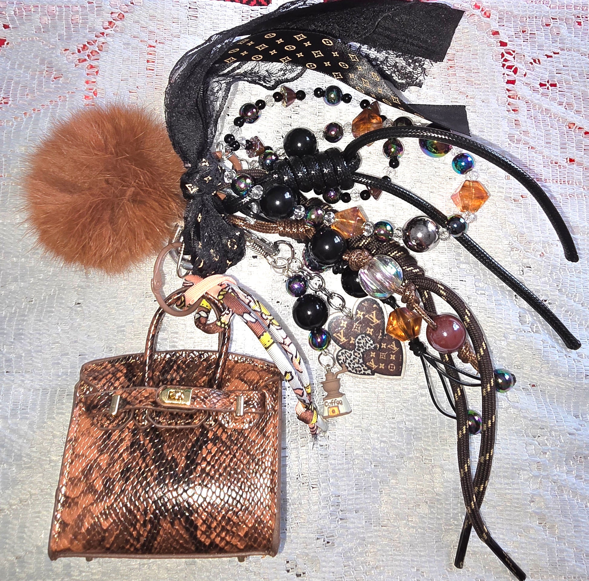 This accessory ensemble feels like a treasure trove curated by a playful collector with a flair for drama and storytelling. The centerpiece—a miniature snakeskin handbag with a metallic sheen—evokes the glamour of a high-fashion runway, while the oversized brown fur pom-pom adds a touch of cozy extravagance. Beaded cords in rich jewel tones (amber, amethyst, obsidian) twist and tangle like enchanted vines, adorned with whimsical charms: a tiny bear, a star, and gilded trinkets that hint at secret adventures.